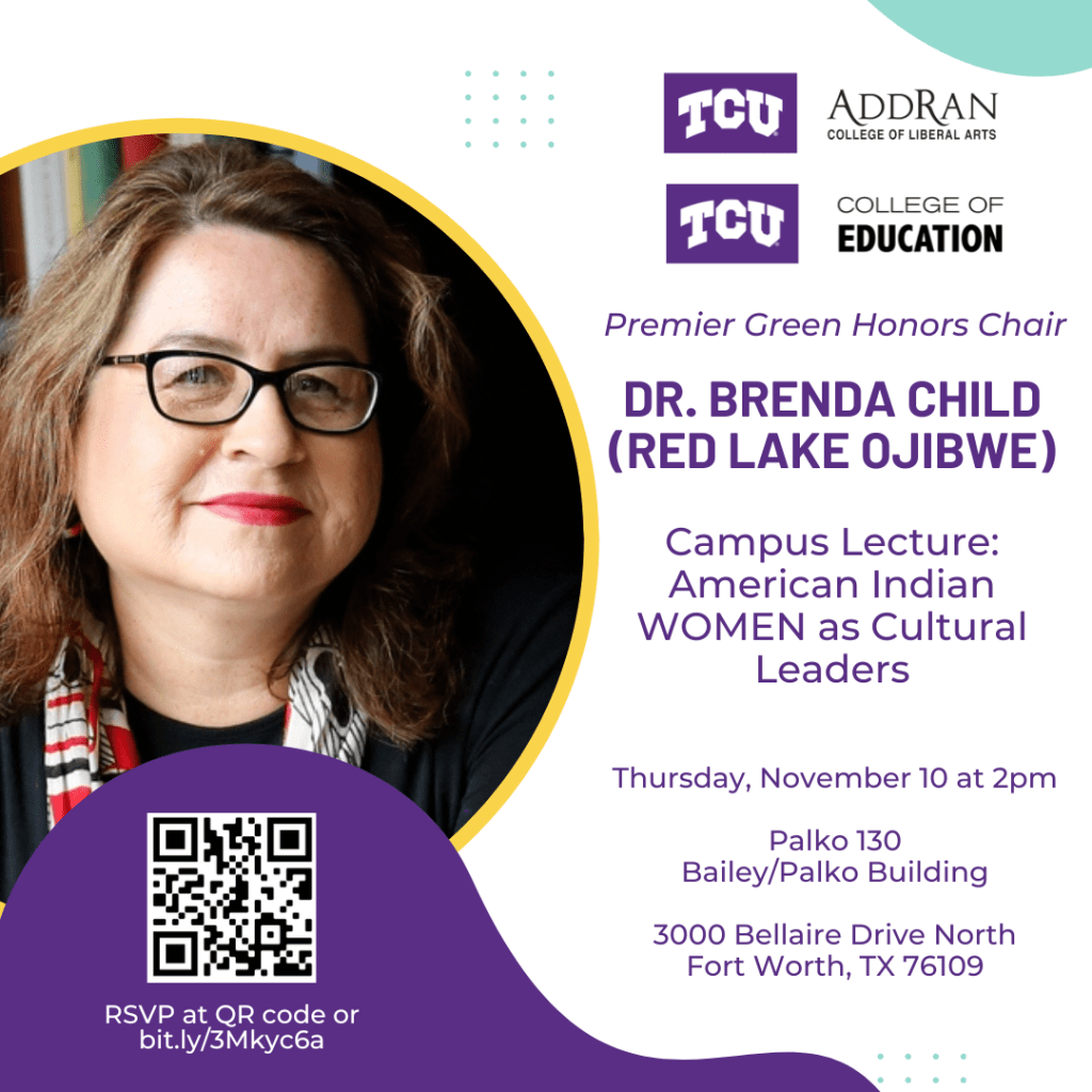 More recently, thank you to Brenda Child (Ojibwe, Red Lake Band) for giving a full week’s time to TCU recently, in a whole range of informative and energizing sessions. A talk on the complex history of boarding schools, a call to extend the presence of Native Studies among or university’s academic programs, a modeling of public scholarship in action, a celebration of Native culture’s presence in a children’s literature text, a commitment to connecting with local Native communities, and an energizing lecture on Native women’s diverse paths to social agency and leadership—these are just the main official occasions of your teaching. Beyond this packed schedule of presentations and conversations, you embodied and demonstrated ways of doing and learning together that we who had the benefit of time with you will be able to draw on for years to come.