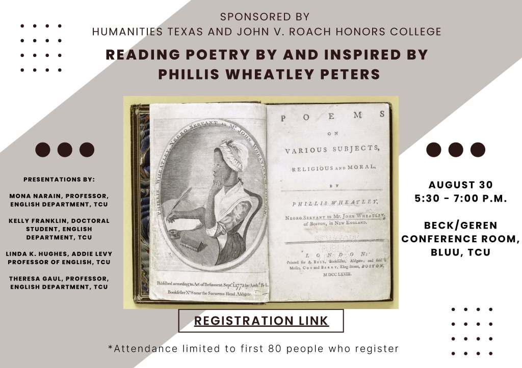 This is an apt time for reflection. For one thing, as the e-newsletter “This Week in Literary History” has observed, Wheatley’s book, Poems on Various Subjects, Religious and Moral, was published at the beginning of September in 1773. So we have reached a major anniversary week within our anniversary year. For another, our project team has now completed a generative set of initial activities: one academic semester (spring 2023) and a summertime smaller cluster of events tied to this anniversary year. We’re now launching our fall programming. As I’m composing this website posting, at the end of August, I’m looking ahead to an August 30 roundtable of TCU faculty members who will share poems from Wheatley’s important 1773 book and set them in dialogue with recent texts inspired by her story and her authorship—specifically by drea brown (in dear girl: a reckoning) and Alison Clarke (in Phillis).